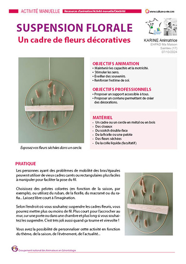 Karine propose une activité manuelle et florale. Cette activité consiste à confectionner une suspension de fleurs qui valorisent l’imagination, la dextérité et la minutie. Vous avez la possibilité de personnaliser cette activité en fonction du thème, de la saison, de l’événement...