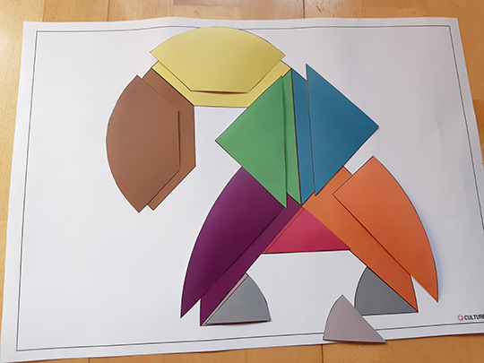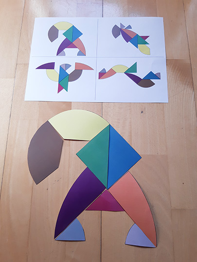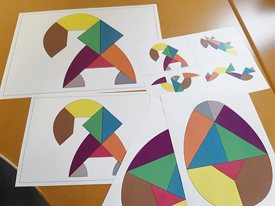 Ce support d’animation est créé sur le principe du tangram. Il s’agit, à partir de formes données, de reconstituer des animaux ou un assemblage de formes données ici en modèles. Les morceaux de couleurs étant assemblées au départ sous la forme d’un œuf, les fêtes de Pâques peuvent être un premier prétexte pour utiliser cette animation qui demande de la concentration. Deux niveaux ont été créés pour être accessible au plus grand nombre. Des modèles en format A6 qu’il faut reconstituer à côté et des modèles format A3 qui permettent de poser les formes de couleurs directement dessus.