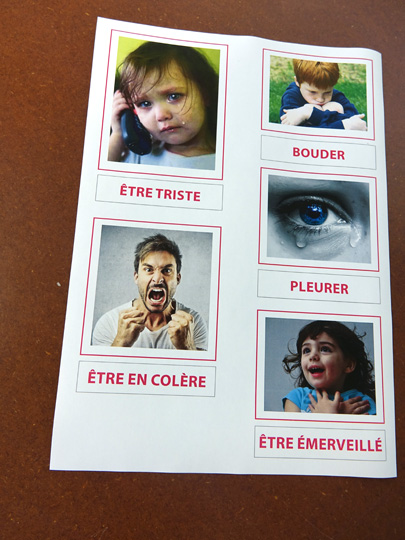 Ce support, composé de mots et d’images, permet de mettre des mots sur des émotions ressenties à partir de photos. Sophie utilise ce support pour des personnes présentant des troubles cognitifs type Alzheimer. Ce support est également composé d’un trombinoscope des émotions qui permet de questionner la personne sur son état d’esprit avant et après l’atelier.