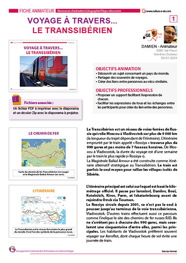 Damien, animateur suisse, partage un support d’animation pour faire voyager les résidents à bord de l’emblématique train, le Transsibérien. Tout en approfondissant leurs connaissances, les résidents pourront faire quelques haltes dans les villes phares, entre Moscou et Vladivostok. Autant de discussions pour s’évader et partager ses souvenirs de voyages en train.